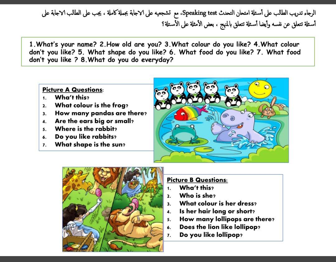 بعض اسئلة امتحان التحدث لغة إنجليزية صف أول فصل ثاني