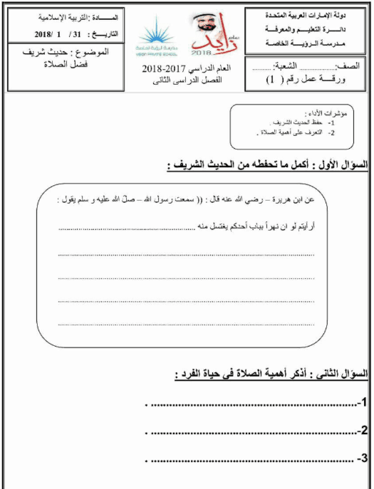 حل درس فضل الصلاة تربية إسلامية صف ثاني فصل أول