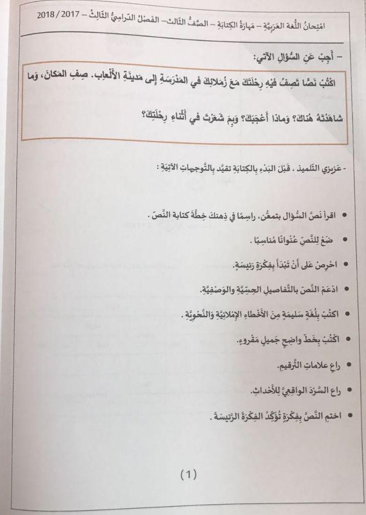 نموذج امتحان لغة عربية محلول صف ثالث فصل ثالث