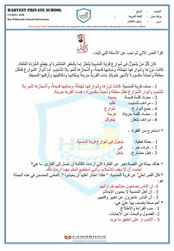 اختبار فهم واستيعاب لغة عربية صف رابع فصل ثالث
