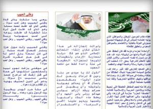 - نؤيد ونبايع ونُهنأك يا ملك المملكة العربية السعودية الهُمام الذي خطط لتنمية البلاد ورعاية الشعب، ورويه بالمحبة والعطف.