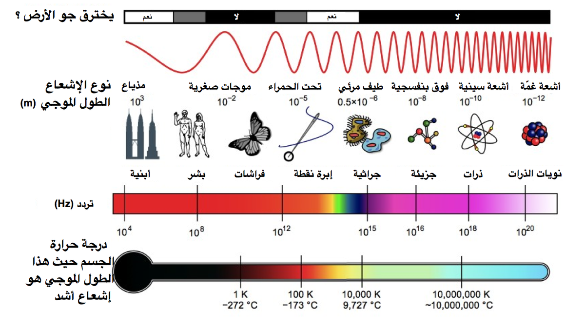 - ويوصف الإشعاع الكهرومغناطيسي بثلاث طرق، وهي الطاقة أو الطول الموجي أو التردد.