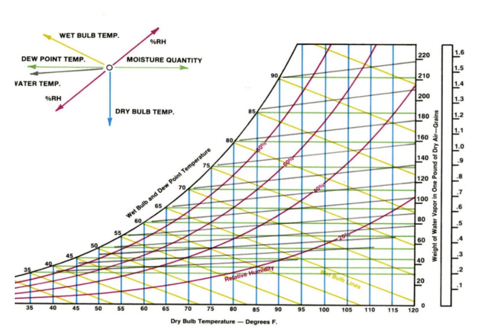 حتى تتمكن من فهم الرابطة بين درجات الحرارة والرطوبة، ومدى المتغيرات الفيزيائية الأخرى التي تدخل في عملية تحديد نسبة الرطوبة في الهواء، فقد قام العلماء بعرض رسم بياني يمكنك من خلاله فهم المتغيرات الحرارية الفيزيائية للهواء ومناطق الراحة للإنسان، ويسمى هذا الرسم البياني بالرسم “السيكرومتري”، فيتم استخدام تصميم المكيفات وأجهزة التبريد والتسخين على هذا النسق.
