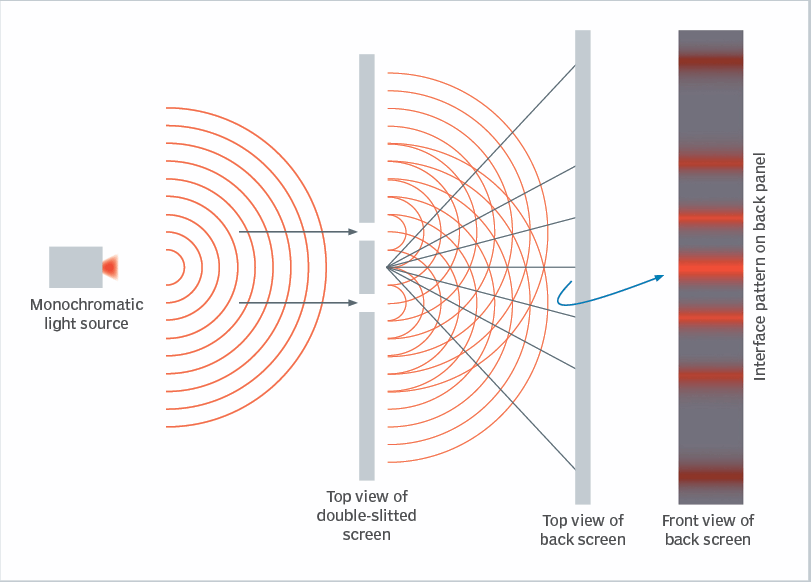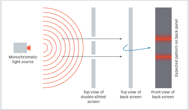 - يوضح الشكل 1 هذا المفهوم. في هذه الحالة تستخدم التجربة ضوءًا أحادي اللون (طول موجة واحد) في الجزء الأحمر من الطيف الكهرومغناطيسي.