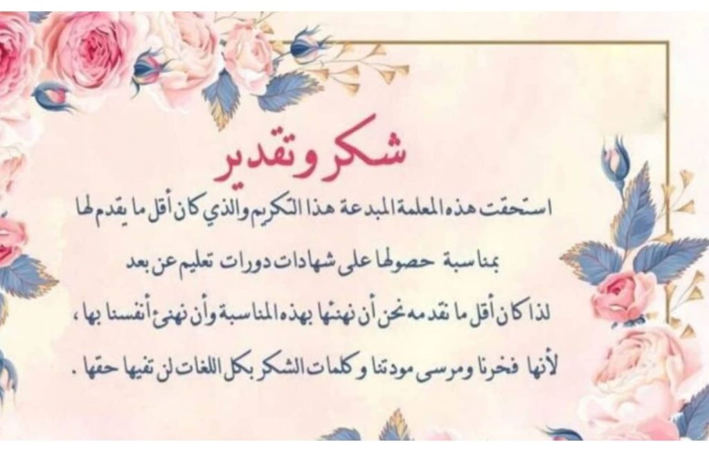 شهادة شكر وتقدير للمعلمة
