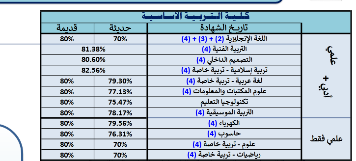 - تُقبل الطالبات خريجات القسم العلمي في الثانوية العامة الراغبات في الالتحاق بكلية التربية الأساسية قسم العلوم بنسبة 76.71% للشهادة الحديثة، و 80% للشهادة القديمة.