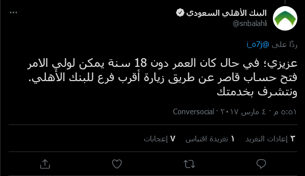 - ودليل على ذلك ما نُشِر من خلال صفحة البنك الأهلي السعودي على موقع التواصل الاجتماعي تويتر رداً على أحد الأشخاص، ويتبين ذلك في الأتي: