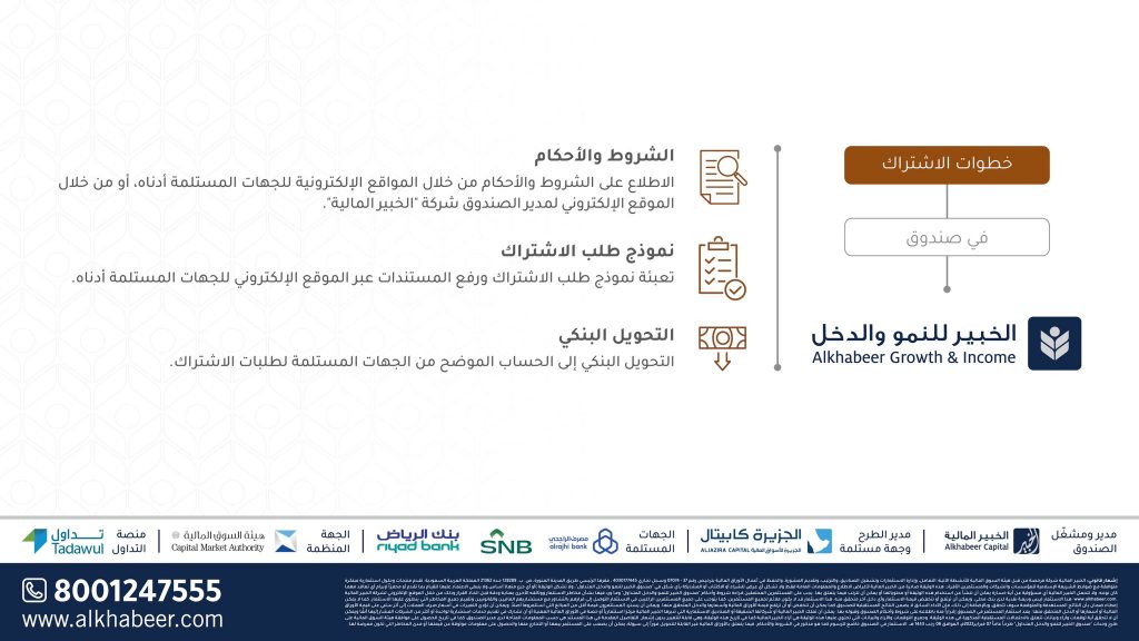 - الاطلاع على كافة الشروط والأحكام من خلال المواقع الإلكترونية التالية: الجهات المستلمة مثل بنك الراجحي أو البنك الأهلي السعودي أو بنك الرياض، ومن الممكن عن طريق الموقع الإلكتروني الرسمي لمدير الصندوق شركة الخبير المالية.
