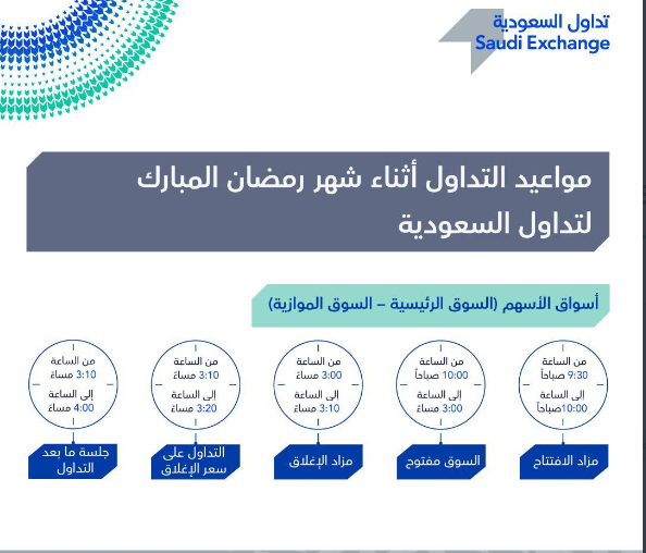 - مواعيد التداول أثناء شهر رمضان المبارك لتداول السعودية أولاً مواعيد أسواق الأسهم؛ حيث السوق الرئيسية والسوق الموازية.