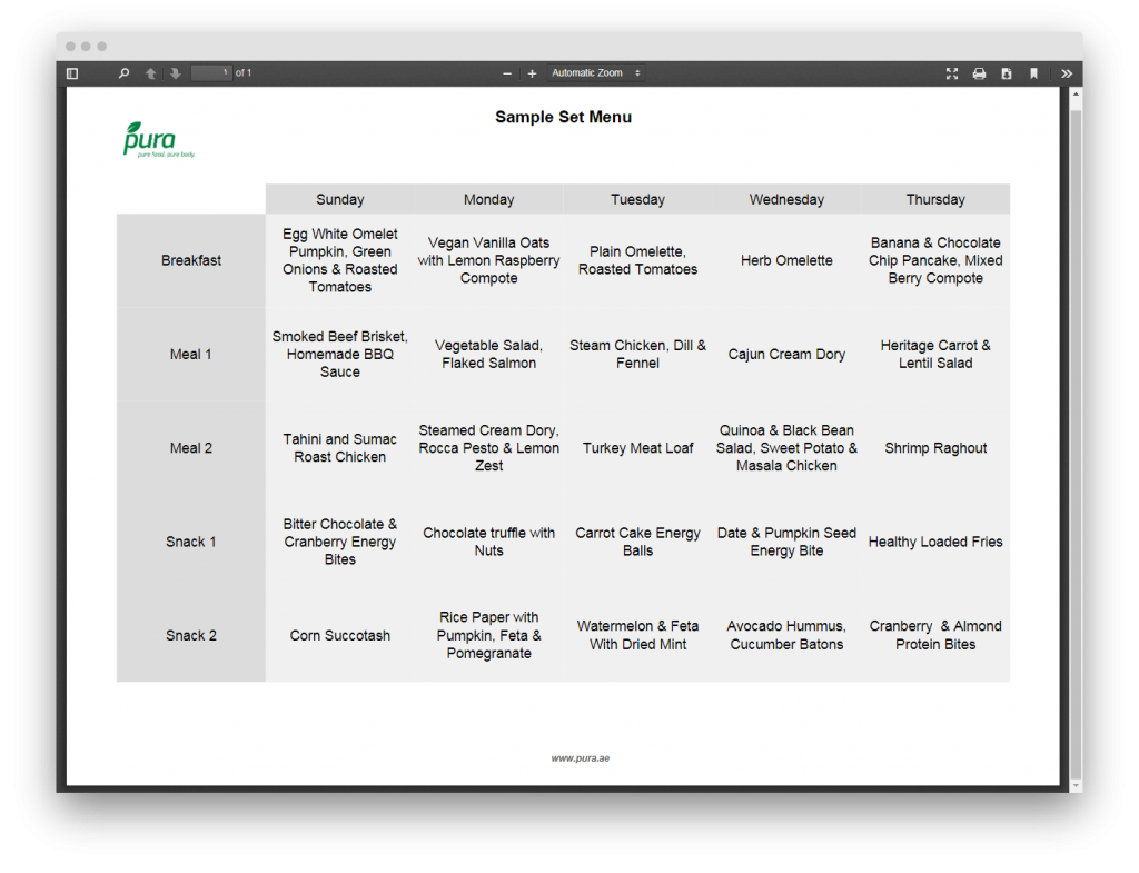 - يُقدم 4 وجبات على مدار اليوم، لمدة 5 أيام في الأسبوع بقدر سعرات حرارية يتراوح بين 1500 و 1800 سعر حراري، وذلك مقابل 125 درهم إماراتي لليوم أو 2905 درهم إماراتي في الشهر كحد أدنى.