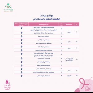 - لاسيما تتوافر مستشضفيات الكشف المبكر بالماموغرام في التجمع الصحي بالقصيم، وتجمع الاحساء، ونجران.