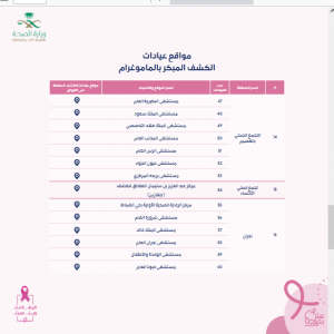 أتاحت وزارة الصحة في المملكة العربية السعودية مواقع عيادات مخصصة للفحص المبكر لسرطان الثدي.