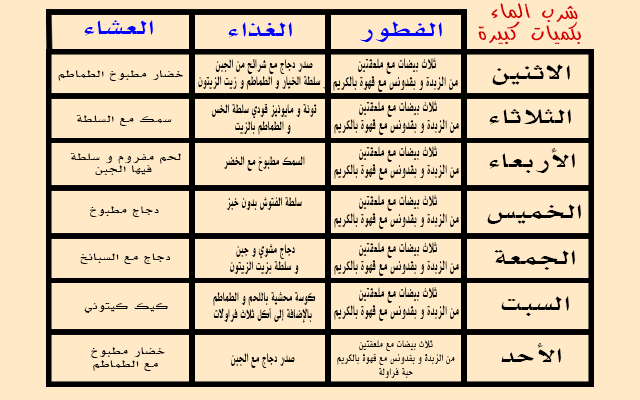 ويوضح لكم هذا الجدول نموذجا لنظام غذائي خاص ببنية الاشخاص الرياضين، وذلك على مدار سبع ايام .