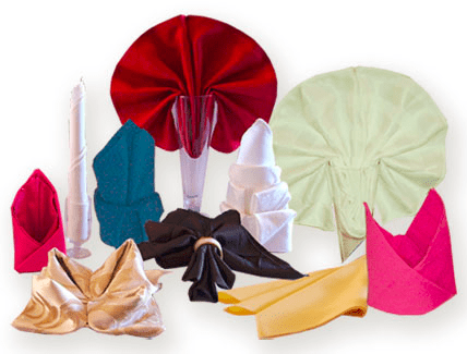 - وهناك العديد من الأشكال لطي مناديل المائدة منها البسيط ومنها الصعب، ويجب أن يكون المنديل مكويا.