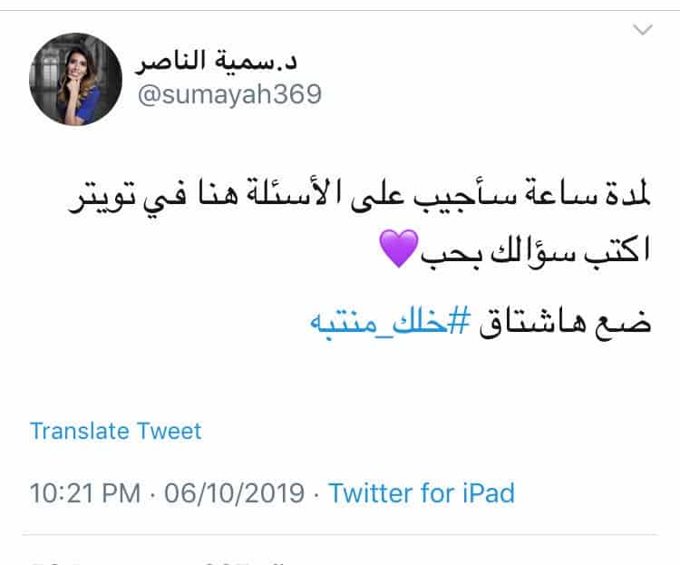 يذكر أن هاشتاق خليك منتبه كان قد انطلق بالأمس من الدكتورة سمية الناصر، حيث دشنته لتجيب فيه عن أسئلة واستفسارات متابعيها على موقع التواصل الاجتماعي تويتر، لكن اليوم تغير توجه الهاشتاق لتغريدات متنوعة.