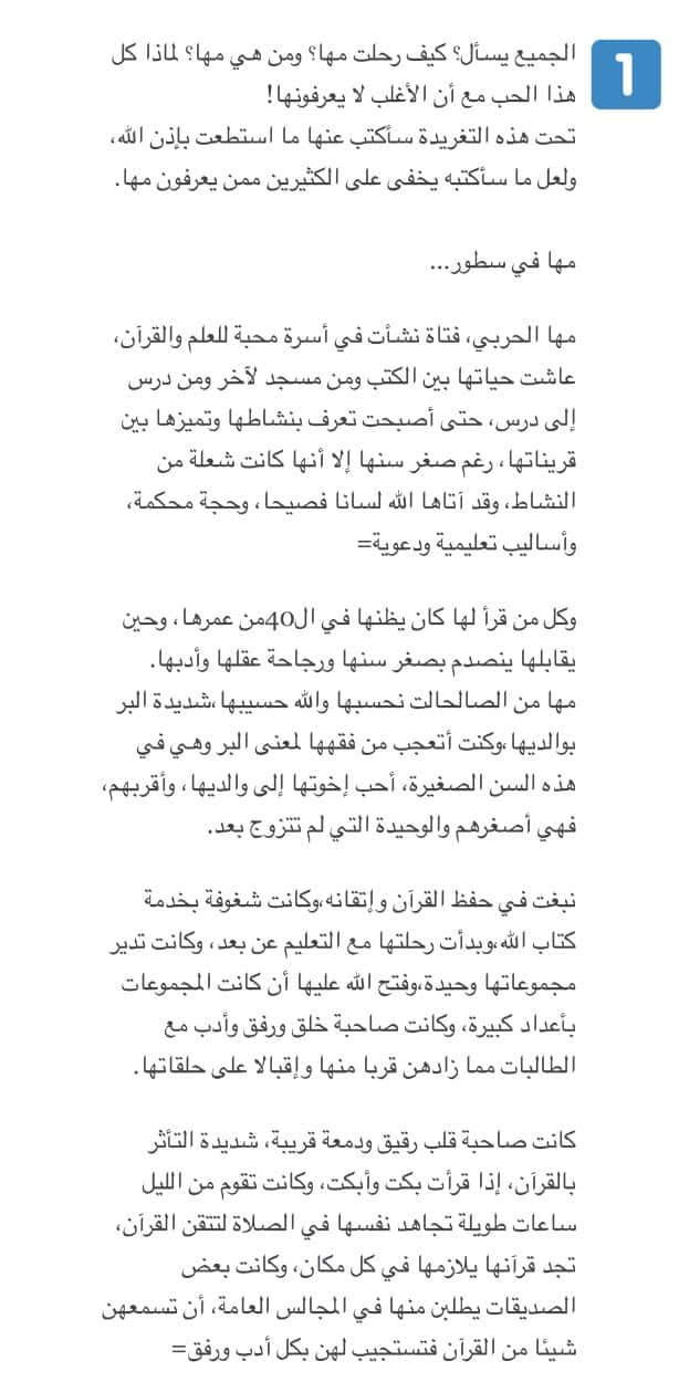 أما حساب سعودي يدعى سمسم فقالت مغردة: “#مها_الحربي_رحمها_الله ما أعرفها بس كلامها قوي “لا تركنوا إلى دنيا فانيه أو صاحب هوى ولاتميلو عند ضال” هذا حالنا للأسف”واعلموا أنكم ستلقون الله وسيسألكم ماذا فعلتم في هذه الأرض اللذي استخلفكم فيها” بالله غير مستعدين ،ألهتنا الدنيا ،أخذنا السعي وراء أيامنا ونسينا أنفسنا