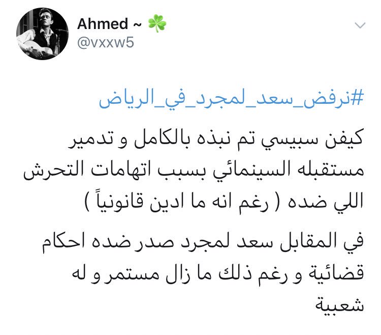 حيث نشر حساب سعودي على تويتر تغريدة قال فيها”#نرفض_سعد_لمجرد_في_الرياض المغتصب المجرم ذا محد تجرأ يسوي له حفلة بعد سواد وجهه إلا احنا بنحتفل فيه يعني! متى تبطلون تدعون المتردية والنطيحة؟! ولا مستخدمين الحفلات رضاوة اللي نفسه في قرشين يحي يغني عندنا لورا بريول تحكي عن ما فعله سعد المجرد بها”.
