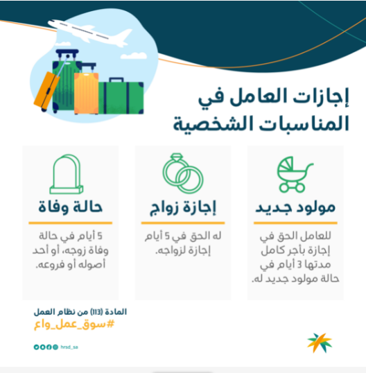 والجدير بالذكر تحرص وزارة الموارد البشرية على إعطاء إجازات بكل المناسبات الشخصية الهامة للموظف السعودي، فهناك إجازة المولود الجديد ومقدارها ثلاث أيام، وإجازة زواج ومقدارها خمس أيام.