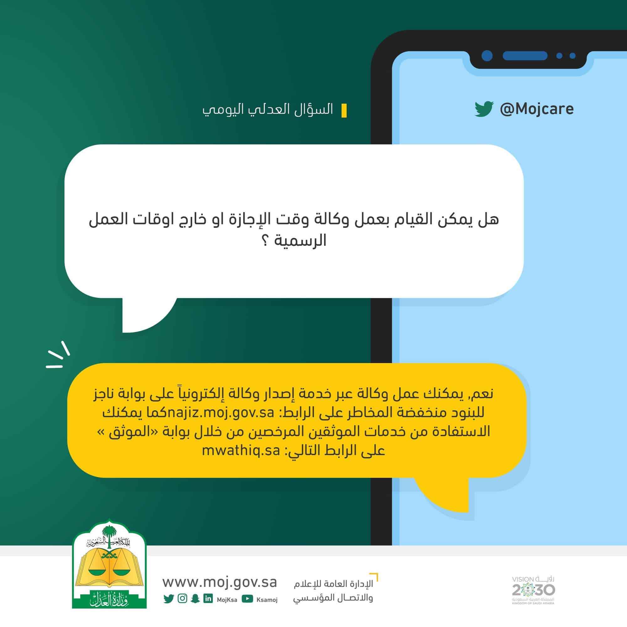 وجاء الرد عليه من خلال نشر انفوجراف “رسم توضيحي” على الحساب الرسمي للتواصل العدلي مكتوب عليه: “نعم، يمكنك عمل وكالة عبر خدمة إصدار وكالة إلكترونيًا على بوابة ناجز للبنود منخفضة المخاطر على الرابط najiz.gov.sa كما يمكنك الاستفادة من خدمات الموثقين المرخصين من خلال بوابة “الموثق” على الرابط التالي: mwathiq.sa”.