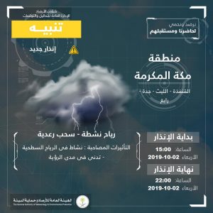 توقعات الطقس -بمشيئة الله تعالى- غداً في #المملكة #طقس_الخريف#نرصد_ونحمي #نحميها pic.twitter.com/G2gvtrpAC6— المركز الوطني للأرصاد (NCM) (@NCMKSA) October 1, 2019