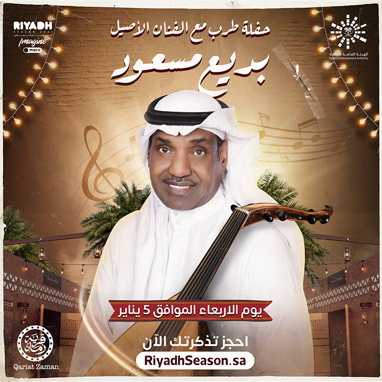 ينظم موسم الرياض حفلة طرب مميز للغاية وفريد من نوعه، وهو حفل الفنان الأصيل بديع مسعود، المقرر إقامته اليوم الأربعاء الموافق 5 يناير 2022، بداية من الساعة 9:30 مساءً، وسيقام الحفل في قرية زمان، في إطار فعاليات موسم الرياض لعام 2022