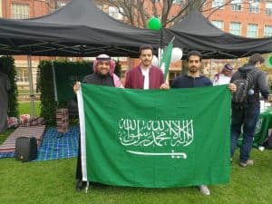 كما خصص منظموا الحفل ركنًا في الجامعة مقدمين فيه الضيافة للمدعوين، حيث قدموا التمر والقهوة العربية، وأدى الطلاب المبتعثون العرضة، وعبروا عن فرحهم بالتقاط الصور التذكارية وبعثوا بالتهنئة إلى القيادة والشعب السعودي.