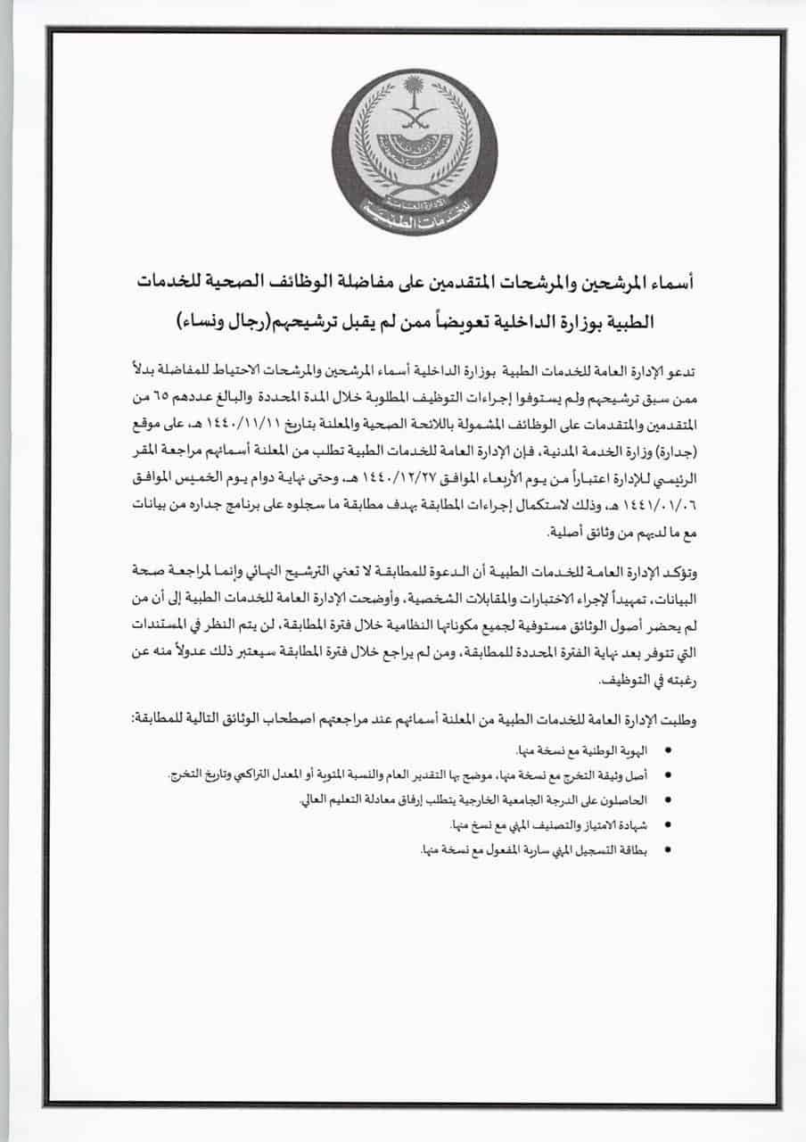 وأكدت إدارة الخدمات الطبية على أن المرشحين والمرشحات الواردة أسمائهم عليهم الإسراع في التوجه للإدارة في الفترة الزمنية اعتبارًا من اليوم الأربعاء وحتى 6/1/1441 هجريًا، وذلك بالمقر الكائن في حي الصحافة بطريق العليا العام.