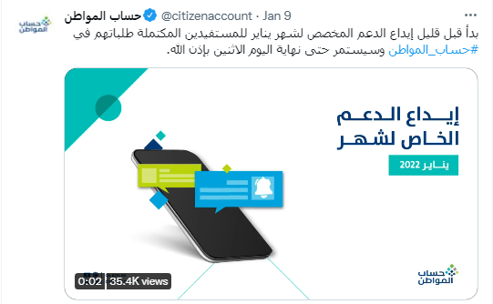 أعلن حساب المواطن عبر حسابه الشخصي على موقع تويتر أمس الأحد 9 يناير 2022 عن بداية إيداع الدعم للمستفيدين، ومن المقرر وصول الدعم للكل نهاية اليوم الإثنين، ولكن بعد التأكد من استيفاء المستفيد لكافة الشروط والطلبات.