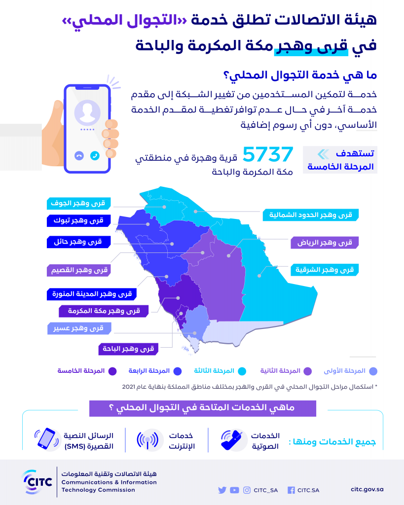 أعلنت هيئة الاتصالات وتقنية المعلومات عن بداية المرحلة الخامسة من خدمة التجوال المحلي، وقررت الهيئة توجيه العمل في منطقتي مكة المكرمة والباحة.