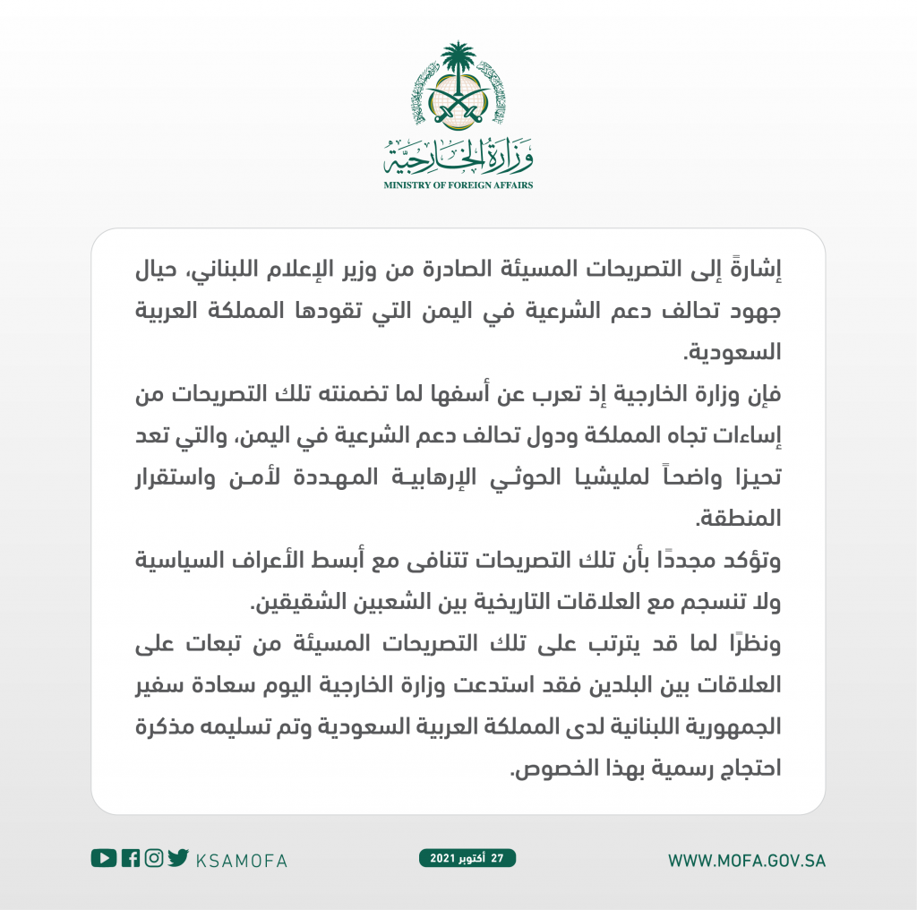 قامت وزارة الخارجية بالمملكة العربية السعودية بالإعلان عن بيان رسمي لاستدعاء السفير اللبناني في العاصمة الرياض وذلك بشأن تصريح الإعلامي ووزير الإعلام اللبناني جورج قرداحي في برنامج برلمان الشباب وما قاله حول الحرب اليمينية، مما سبب خلال بين المملكة العربية السعودية ودول الخليج العربي، ودولة لبنان.