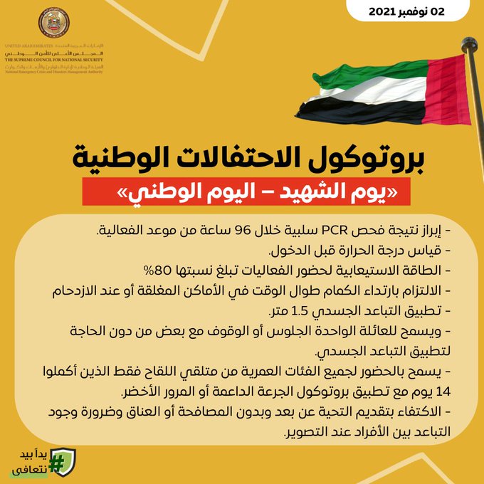 - ولعلنا نوضح لك عزيزي القارئ من خلال الصورة التالية بروتوكول الاحتفال بالعيد الوطني في دولة الإمارات العربية المتحدة، للحفاظ على سلامة أبناء الدولة.