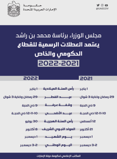 أما عن العطل الرسمية التي يعتبر العيد الوطني في دولة الإمارات العربية المتحدة واحدا منها في موعده بتاريخ الثاني والثالث من شهر ديسمبر من كل عام، فتتجلى عزيزي القارئ من خلال الصورة التالية.