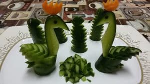 يمكن الاعتماد على تزيين الأطباق بالخيار، وذلك لأنه يمتاز باللون المميز والرائع، ويمكن عمل ورود من الخيار، وذلك عن طريق تقشير الخيار وقطعه إلى نصفين، وبعد ذلك يتم خلي الخيار تماما من البذور، ويتم تشقيق القطعة الخارجية إلى عدة شقوق، ويكتمل بذلك شكل الوردة، ويمكن وضع أي نوع من الخضروات في المنتصف حتى يتم تناسق الألوان مع بعضها البعض.