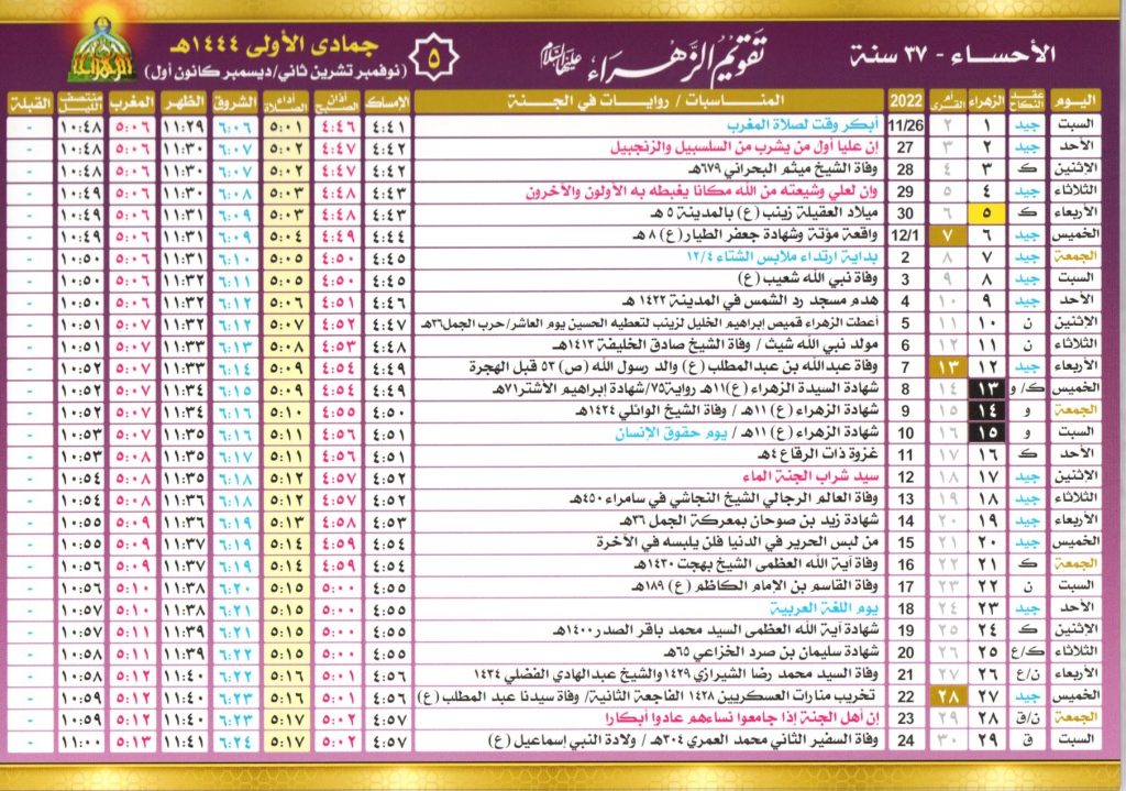 تقويم الزهراء 1445