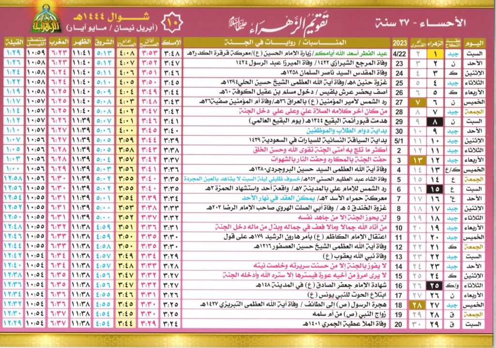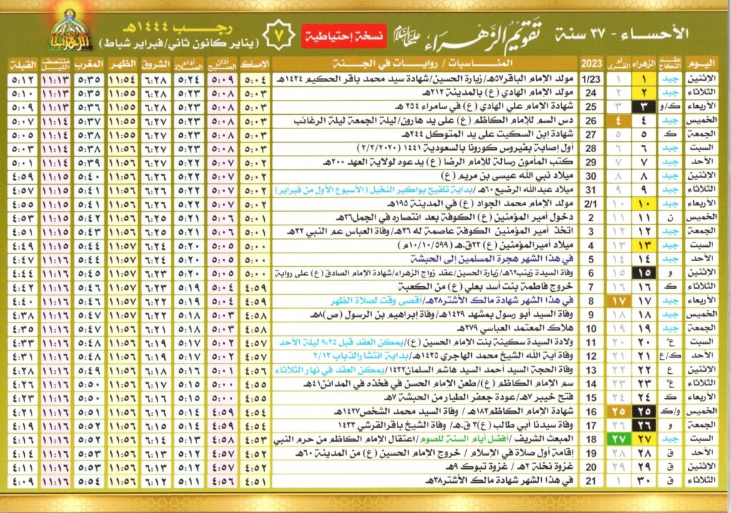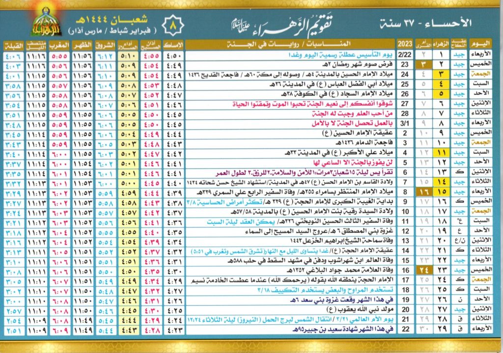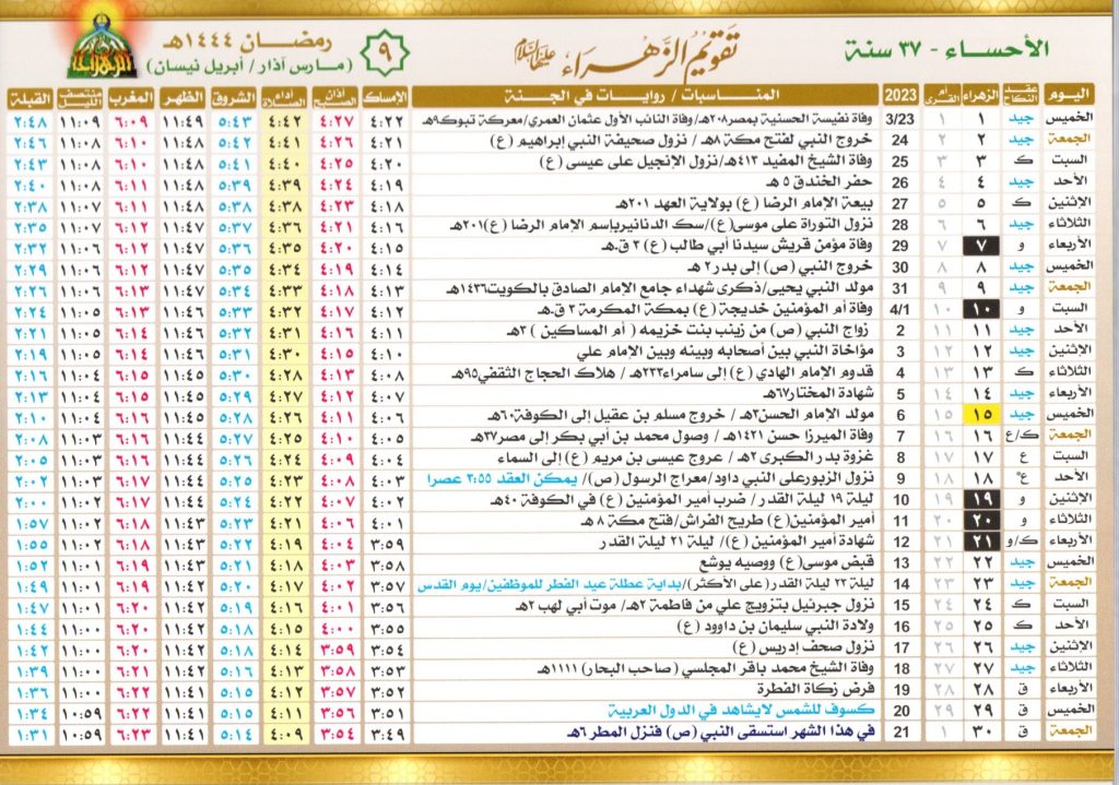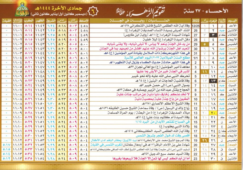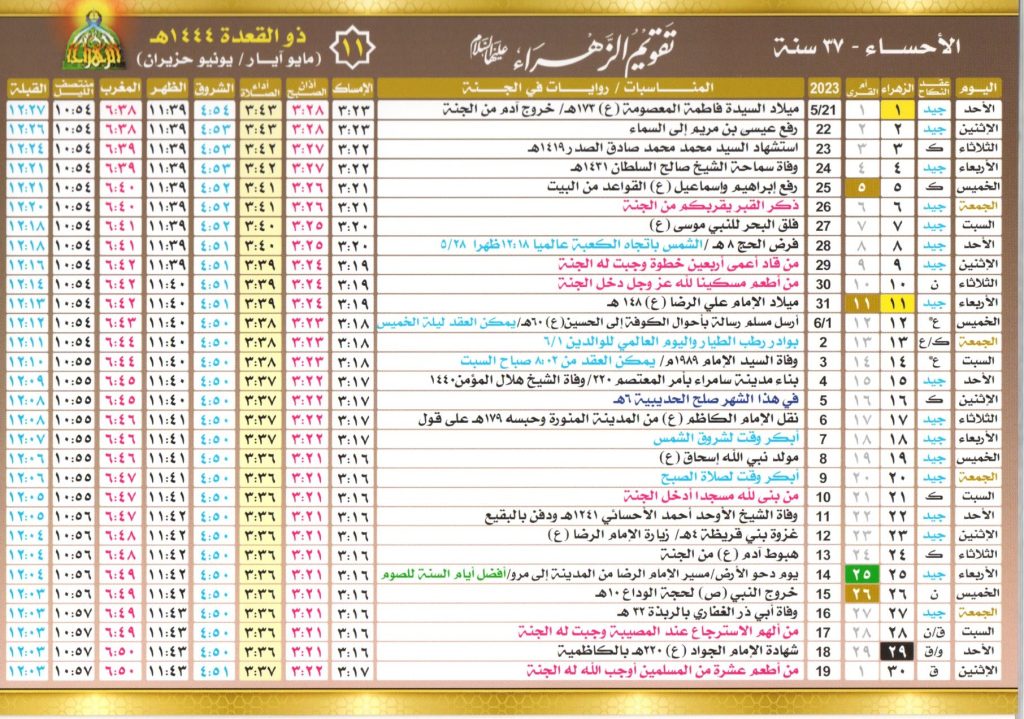 يبدأ التقويم الهجري للمسلمين من شهر محرم، حيث يتابع مواطنين المملكة العربية السعودية خاصة أهل مدينة الأحساء تقويم الزهراء، لمعرفة اهم أيام الصيام وبداية كل شهر ومواعيد الإمساك ومواقيت أداء كل فرض، لهذا قامت المملكة السعودية بإصدار التقويم الهجري لعام 1445 ليتمكن المسلمين من متابعة بدايات الأشهر بشكل واضح.