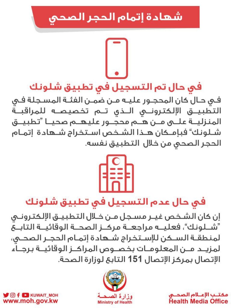 - بعد ذلفك ستصدر لك شهادة إنهاء فترة الحجر الصحي إلكترونيا عبر تطبيق شلونك التابع إلى وزارة الصحة الكويت.