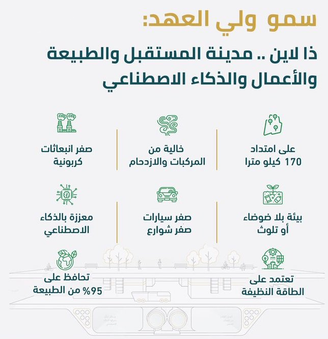 من الجدير بالذكر أن مدينة ذا لاين قائمة في الأساس على الطاقة المتجددة بنسبة 100%، والتي ستتمثل أعلى نسبة للحفاظ على البيئة البرية والبحرية بنسبة تقترب من 95%، وستكون متفوقة على الكثير من البلاد المتقدمة التي تهتم بالحفاظ على البيئة كأستراليا وفرنسا، إضافة إلى ربط كل المجتمعات رقمياً في ذا لاين باستخدام 90% من البيانات، فمن شأنه دعم الخدمات وقدرات البيئة التحتية، هذا بجانب إيجاد بيئة صحية خالية تماماً من التلوث، مع العلم أن المدن الذكية الحالية تعمل على 1% من البيانات.