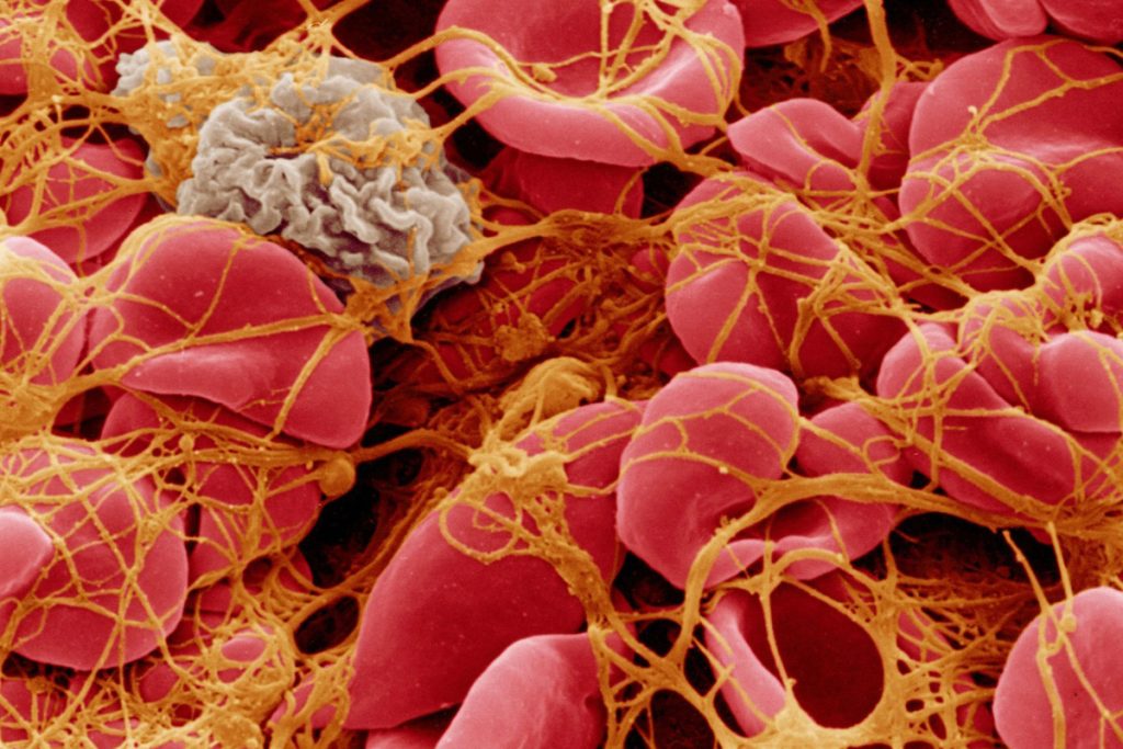 بصورة كبيرة ومن ثم يقوم بنقله إلى داخل بلازما الدم، وهنا تكون مادة الفايبرين مسؤولة عن تجلط الدم.
